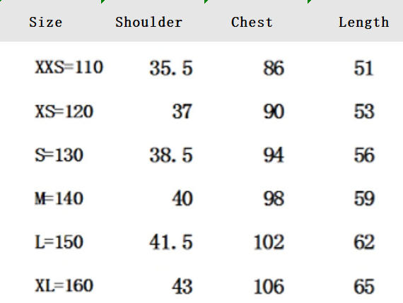 היקף המותניים (ס"מ) היקף ירך (ס"מ) אורך מכנסיים (ס"מ) חזה (ס"מ) אורך (ס"מ) גיל (שָׁנָה) גוֹבַה (ס"מ) גודל 20x2 26x2 30 25x2 35 0.6-1 68-75 S 21x2 28x2 32 26.5x2 37 1-1.5 75-85 M 22x2 30x2 34 28x2 39 1.5-2.5 85-95 L 23x2 32x2 36 29.5x2 41 2.5-3.5 95-105 XL